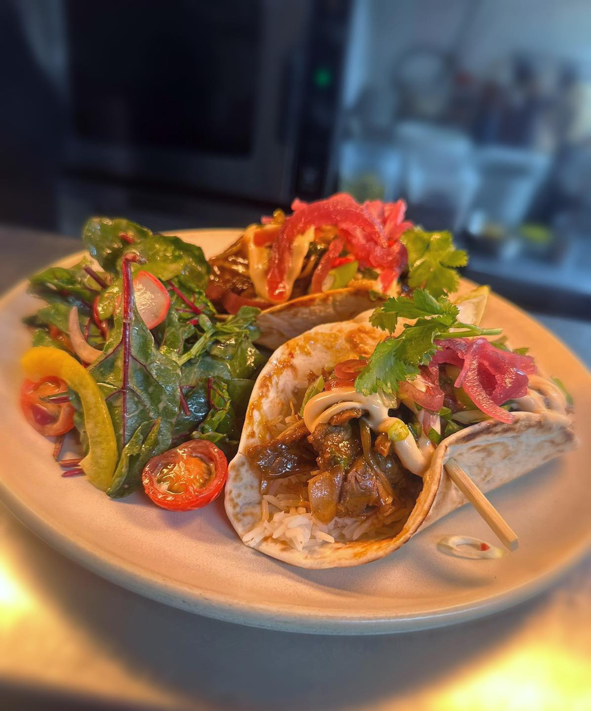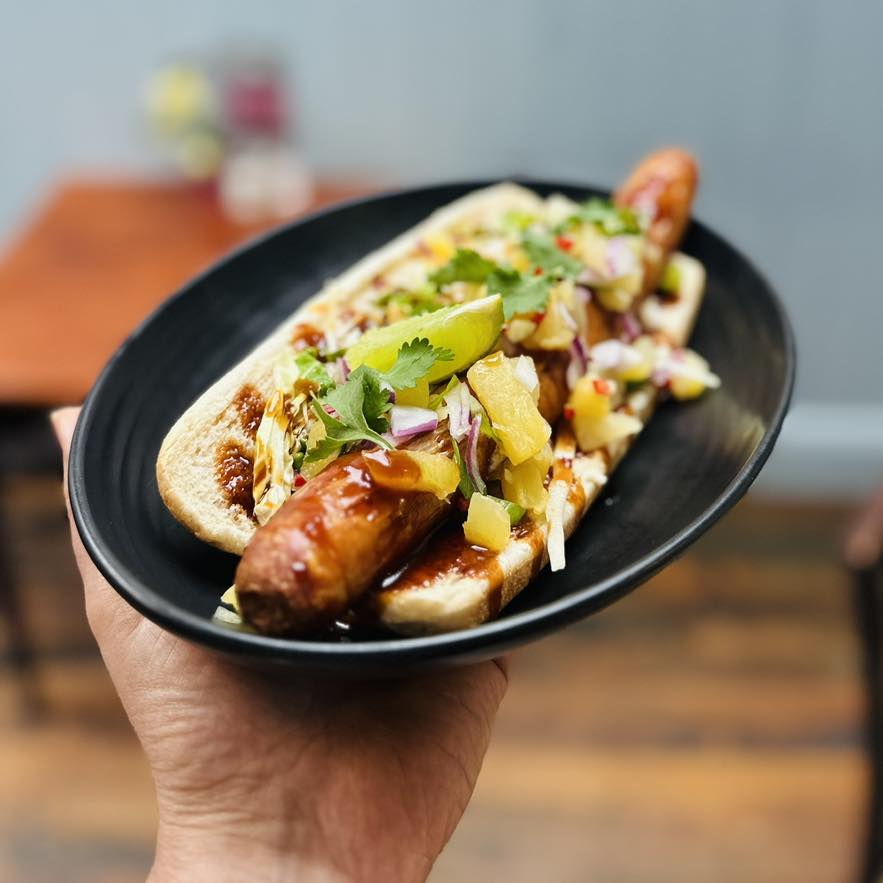 Also new is our Vegan Onion Bhaji Burger, vegan seeded bap, mango Mayo, leaves, tomato, cucumber, spiced onion bhaji & curried mango sauce.